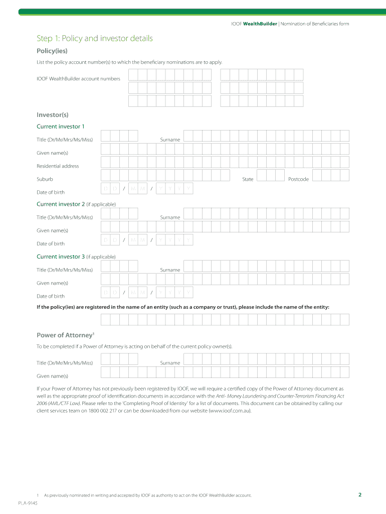 ROOF WealthBuilder 11 December 2014 Nomination of Beneficiaries form Use this form to make a new nomination of beneficiaries or replace or revoke an existing nomination. For assistance please contact