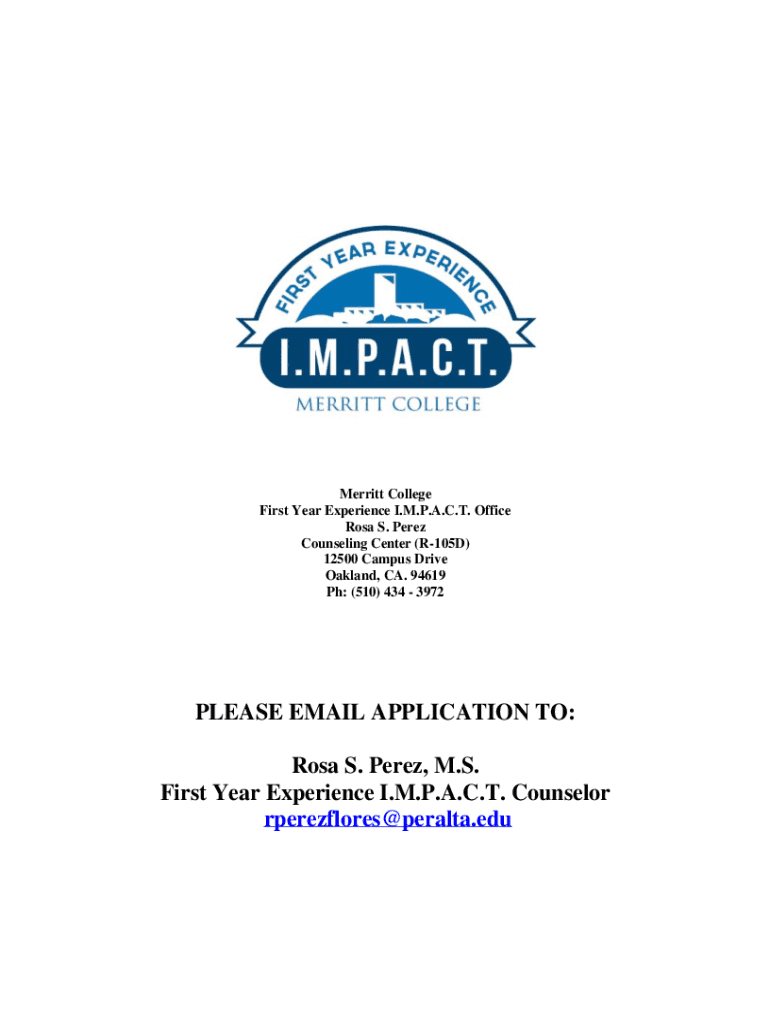 Merritt College First Year Experience I.M.P.A.C.T. Office Rosa S. Perez Counseling Center (R105D) 12500 Campus Drive Oakland, CA. 94619 pH: (510× 434 3972PLEASE EMAIL APPLICATION TO: Rosa S. Perez,