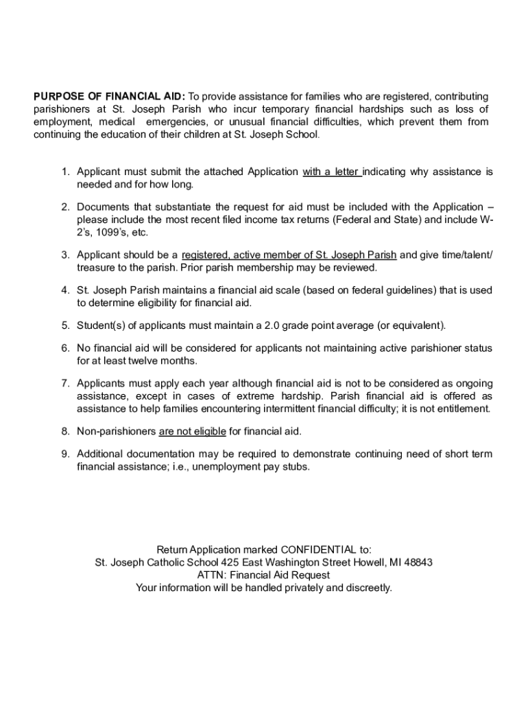 PURPOSE OF FINANCIAL AID: To provide assistance for families who are registered, contributing parishioners at St. Joseph Parish who incur temporary financial hardships such as loss of employment,