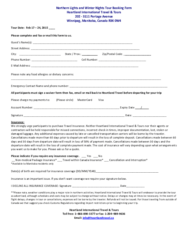 Northern Lights and Winter Nights Tour Booking Form Heartland International Travel & Tours 202 3111 Portage Avenue Winnipeg, Manitoba, Canada R3K 0W4 Tour Date: Feb 17 24, 2015 ___ Please complete