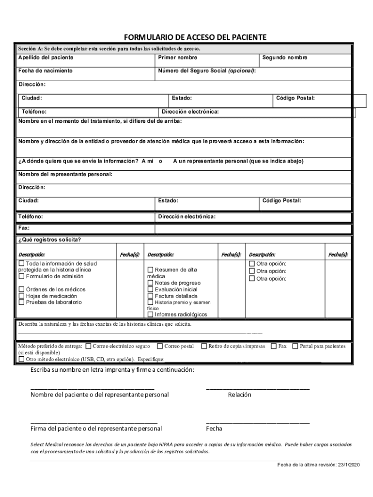 FORMULA RIO DE ACCESS DEL PATIENTS Section A: Se debt completer ESTA section para today leis solicitudes DE access. Adelaide Del pacientePrimer nombreSegundo nombreFecha de nacimientoNmero Del Segura
