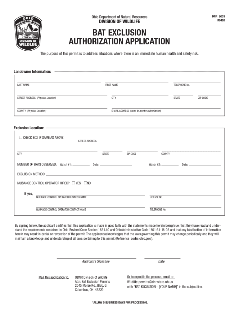 DNR 9053 R0420BAT EXCLUSION AUTHORIZATION APPLICATION The purpose of this permit is to address situations where there is an immediate human health and safety risk. Landowner Information: LAST NAMEFIRST