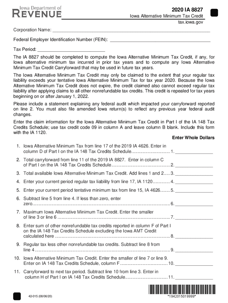 2020 IA 8827 Iowa Alternative Minimum Tax Credit tax.Iowa.gov Corporation Name: ___ Federal Employer Identification Number (VEIN): ___ Tax Period: ___ The IA 8827 should be completed to compute the