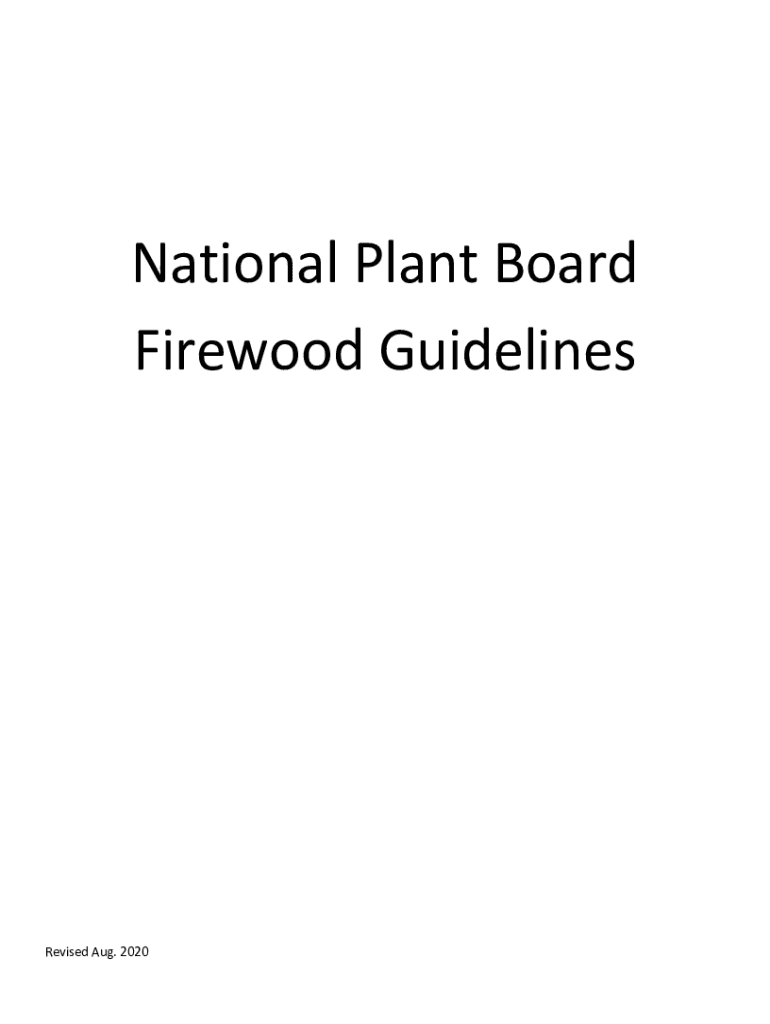 National Plant Board Firewood GuidelinesRevised Aug. 2020TABLE OF CONTENTS 1. Introduction a. Overview 2. Regulations a. Overview b. Quarantine Template c. Heat Treatment Standards d. Compliance Agreements