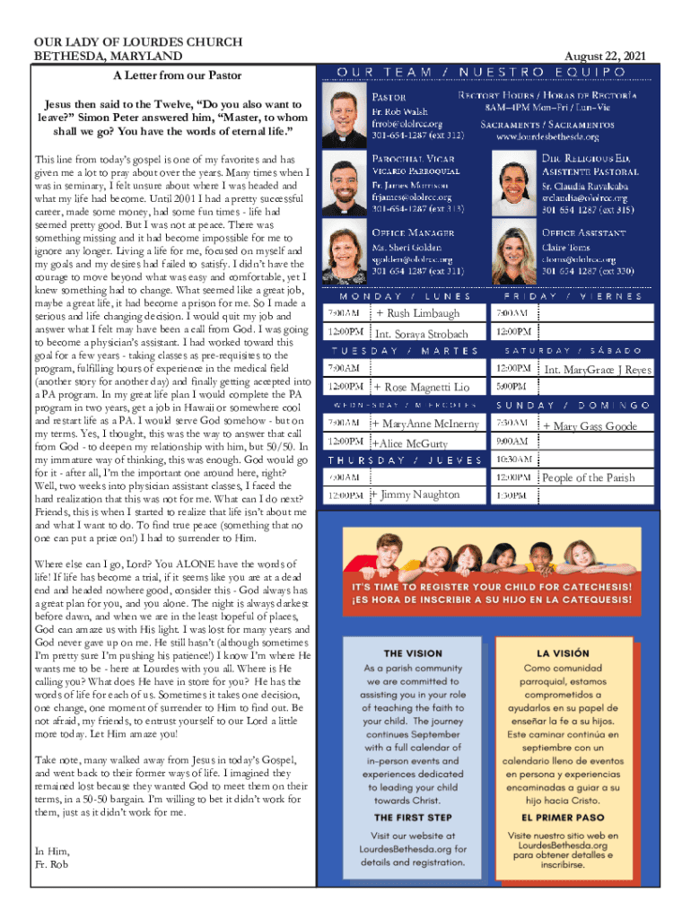 OUR LADY OF LOURDES CHURCH BETHESDA, MARYLAND A Letter from our Pastor August 22, 2021Jesus then said to the Twelve, Do you also want to leave? Simon Peter answered him, Master, to whom shall we go?