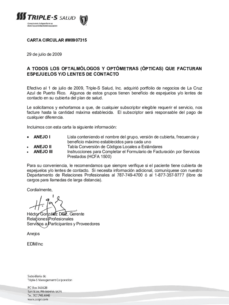 CARTA CIRCULAR #M0907315 Gina 1 DE 11 29 de Julio de 2009 CARTA CIRCULAR #M0907315 29 de Julio de 2009A To-dos LOS OFTALMLOGOS Y OPERAS (OPTICAL) QUE FACTUAL ESPEJUELOS Y×O LENSES DE CONTACT Effective