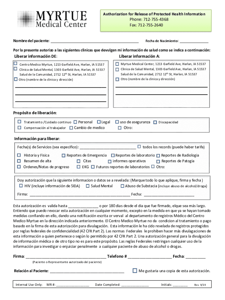 Authorization for Release of Protected Health Information Phone: 7127554368 Fax: 7127552640Nombre Del patients: ___Tech de Nacimiento: ___POR la present authorize a leis migraines clinical Que divulge