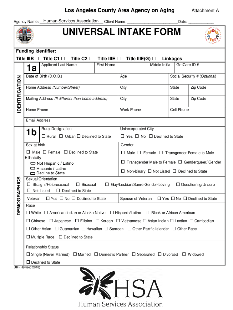 Los Angeles County Area Agency on AgingAttachment Human Services Association Client Name: ___Date: ___ Agency Name: ___UNIVERSAL INTAKE FORM Funding Identifier: Title AIIB Title C1 IDENTIFICATION1aTitle
