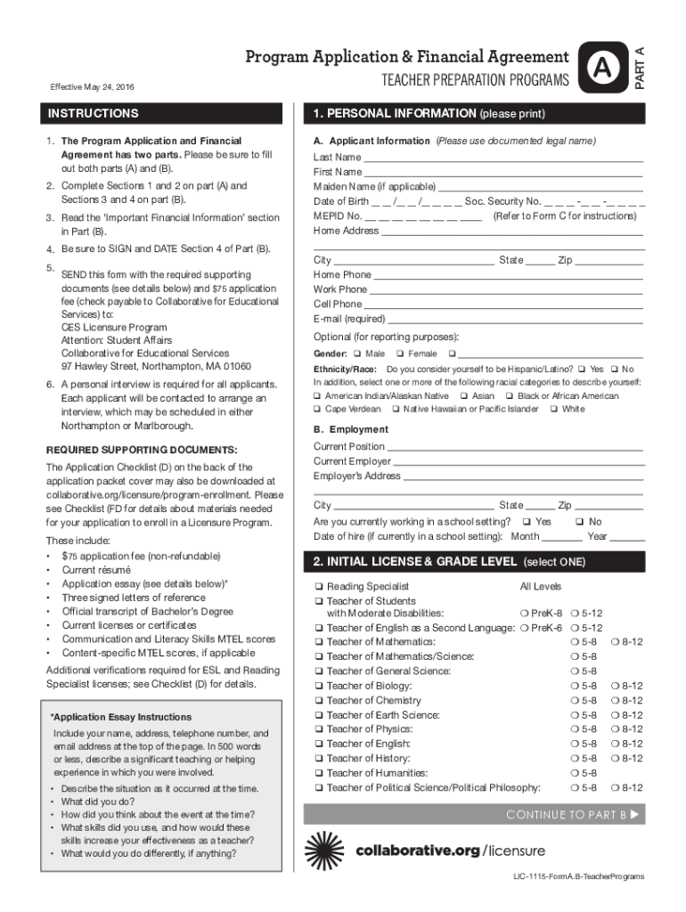 TEACHER PREPARATION PROGRAMSEffective May 24, 2016INSTRUCTIONS1. PERSONAL INFORMATION (please print×1. The Program Application and Financial Agreement has two parts. Please be sure to fill out both
