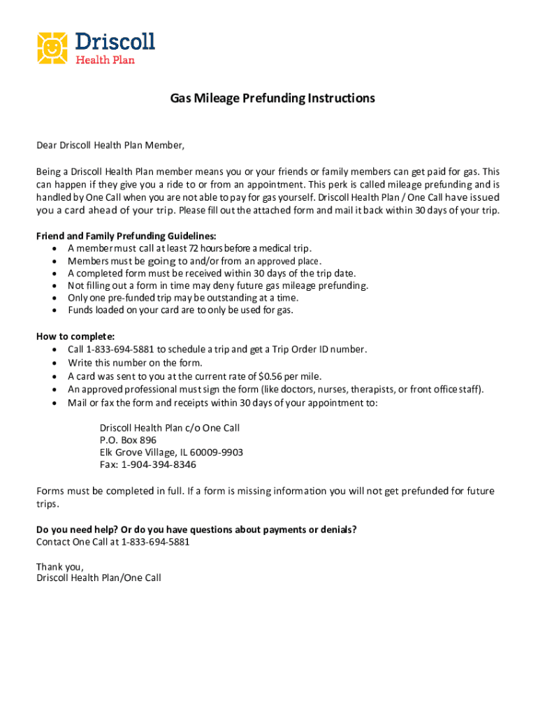 Get the free Gas Mileage Prefunding Instructions - Driscoll Health Plan