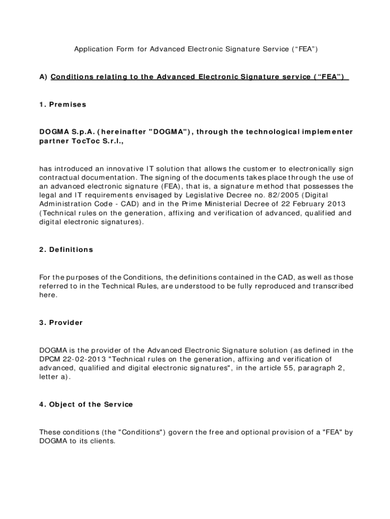 Application Form for Advanced Electronic Signature Service (FEW×A) Conditions relating to the Advanced Electronic Signature service (FEW×1. PremisesDOGMA S.p.A. (hereinafter \” DOGMA\”), through