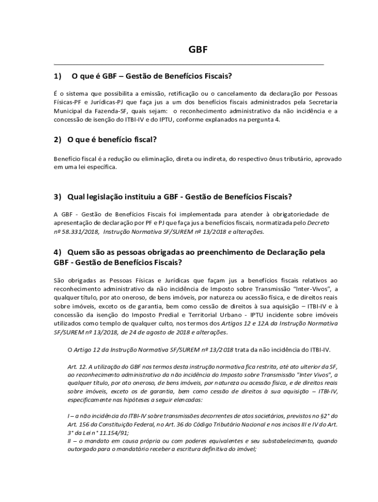 GBF 1)1)O que GBF Gesto de Benefcios Fiscais? o sistema que possibilita a emisso, retificao ou o cancelamento da declarao por Pessoas FsicasPF e JurdicasPJ que faa jus a um dos benefcios fiscais administrados