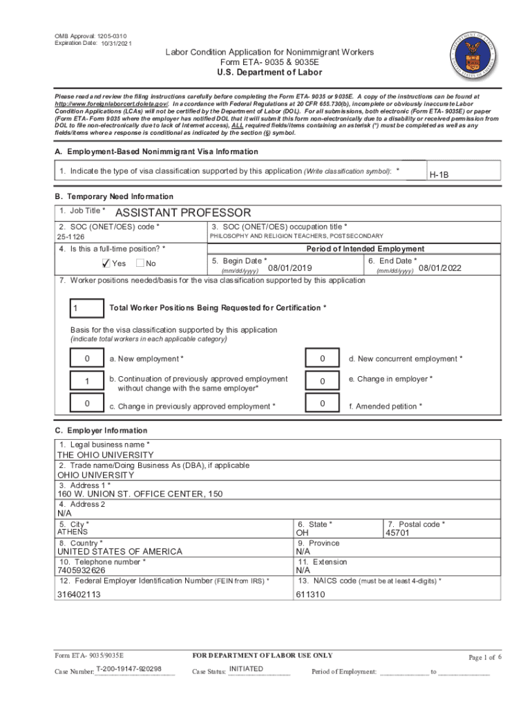 20%$ASSURED ([SLUDWLRQ\'DWH 10×31/2021 /DERU&RQGLWLRQ×SSOLFDWLRQIRU1RQLPPLJUDQW :RUN)RUP ($7 (U.S. Department of Labor Please read and review the filing instructions carefully before completing