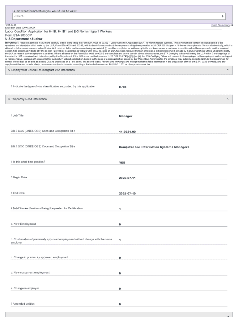 Select what form×section you would like to view: Select Print Summary12050466 Expiration Date: XX×XX/XXXXLabor Condition Application for H1B, H1B1 and E3 Nonimmigrant Workers Form ETA9035CP U.S.