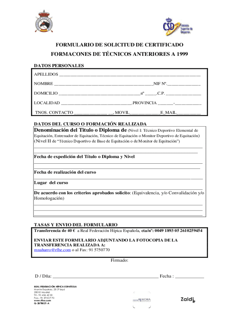 FORMULA RIO DE SOLICITED DE CERTIFICADOFORMACONES DE TUNICS ANTERIOR ES A 1999 DATES PERSONAGES SPELLINGS ___ HOMBRE ___NIF N.___ DOMICILE ___n ___. C.P. ___ LOCALIZED ___.PROVINCIAL ______ TWOS.
