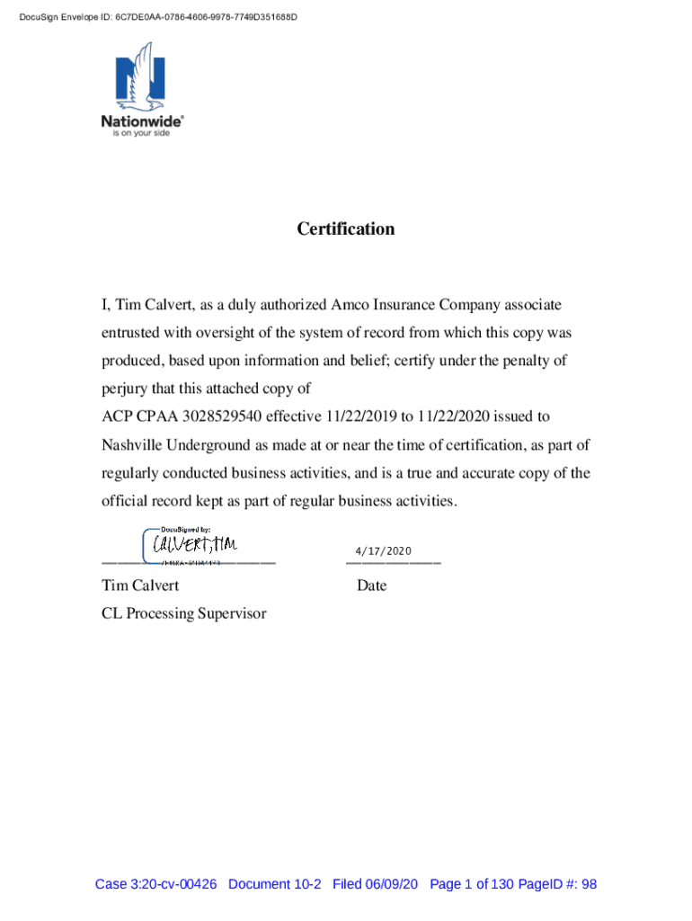 DocuSign Envelope ID: 6C7DE0AA0786460699787749D351688DCertificationI, Tim Calvert, as a duly authorized Ammo Insurance Company associate entrusted with oversight of the system of record from which