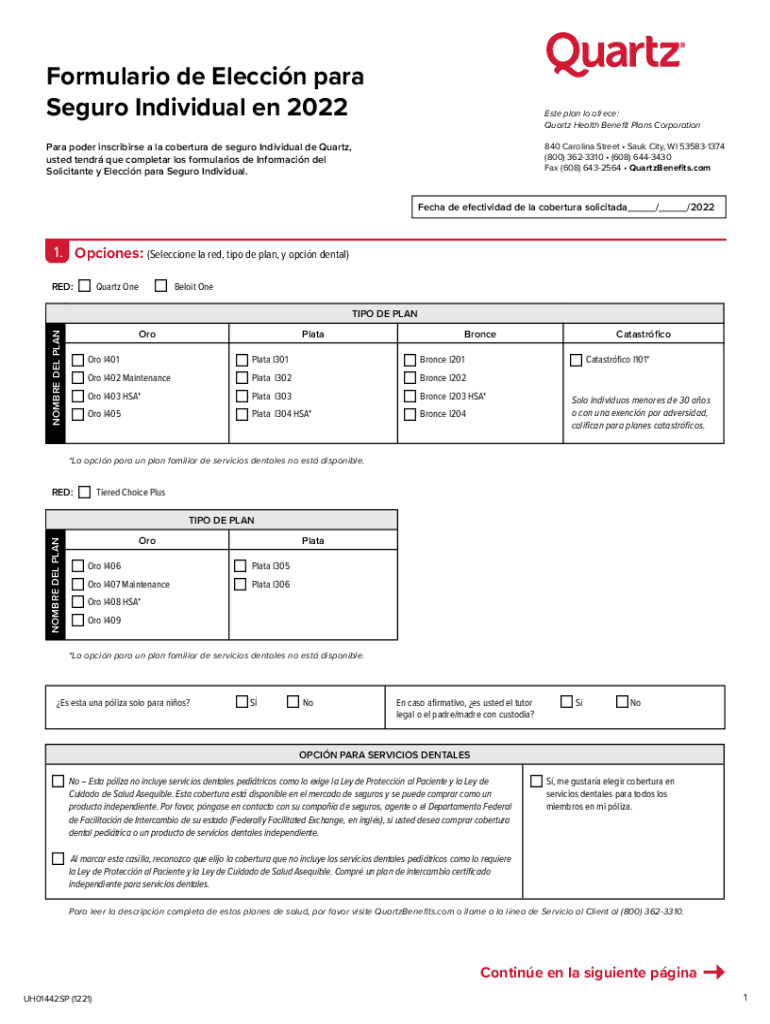 Formulation de Eleccin para Segura Individual en 2022Este plan lo free: Quartz Health Benefit Plans CorporationPara power inscribers à la overture de Segura Individual DE Quartz, used tend Que completer