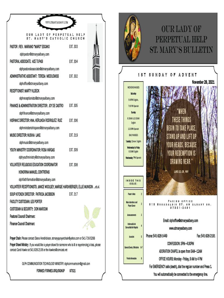 WWW.STMARYSALBANY.COMO U R S T .OUR LADY OF PERPETUAL HELP ST. MARY Bulletins A D Y O F P E R P E T U A L H E L P M A R Y S C A T H O L I C C H U R CH PASTOR : REV. MARIANO MARY SCANTEST. 303olphpastor×stmarysalbany.com
