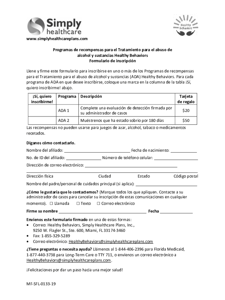 WWW.simplyhealthcareplans.com Estimate affiliate: Gracias POR SU inters en maestros Programs DE recompenses para el Tratamiento para El abuse DE alcohol y substantial (ADA) Healthy Behaviors (Comportamientos