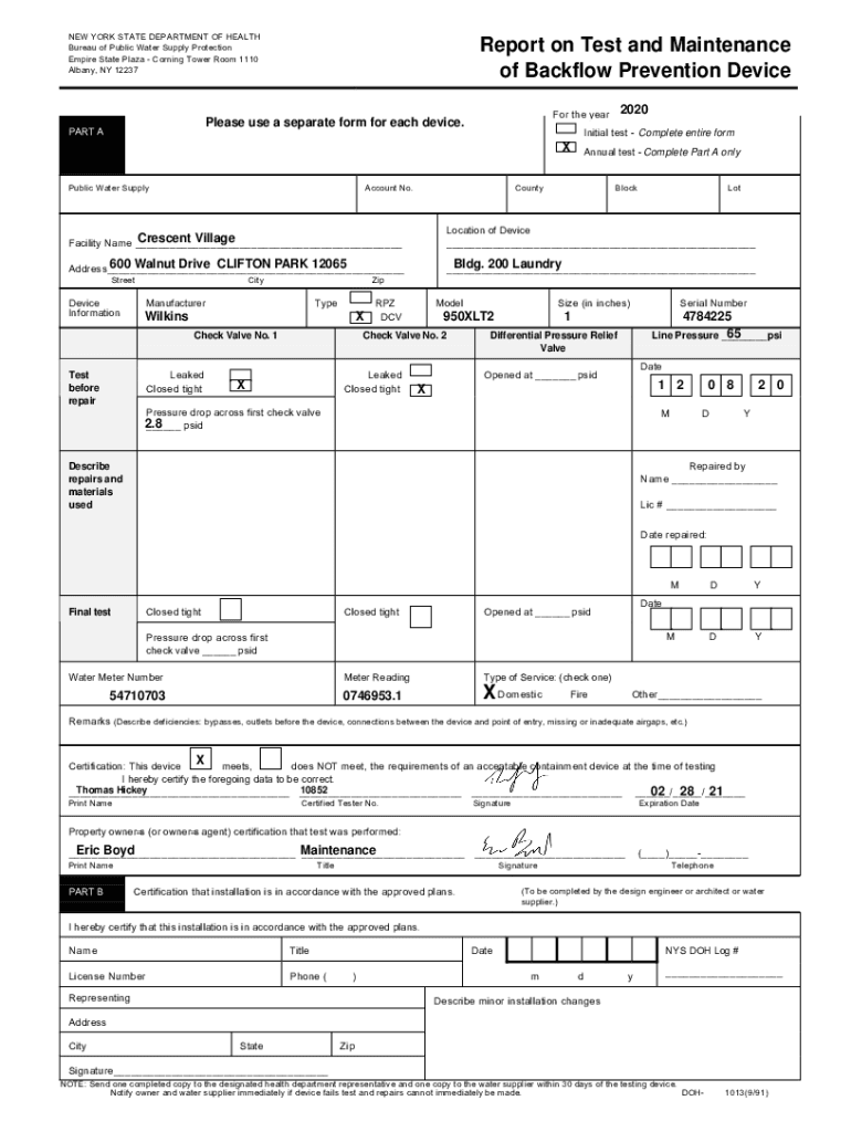 NEW YORK STATE DEPARTMENT OF HEALTH Bureau of Public Water Supply Protection Empire State Plaza Corning Tower Room 1110 Albany, NY 12237Report on Test and Maintenance of Backflow Prevention Device