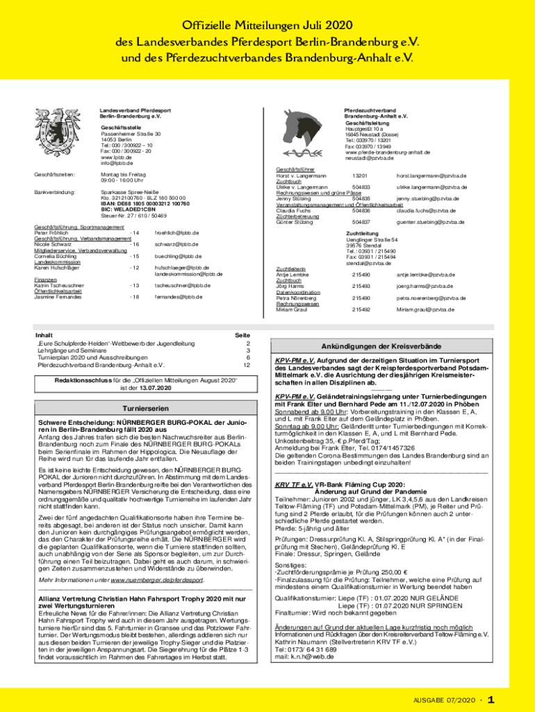 Officially Mitteilungen July 2020 DES Landesverbandes Pferdesport Berlin Brandenburg e.V. UND DES Pferdezuchtverbandes BrandenburgAnhalt e.V. Landesverband Pferdesport Berlin Brandenburg e.V. Pferdezuchtverband
