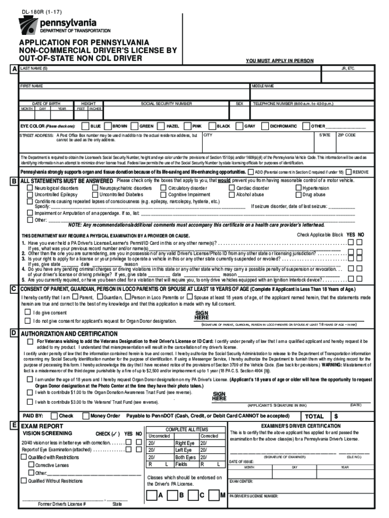 DL180R (117×APPLICATION FOR PENNSYLVANIA NONCOMMERCIAL DRIVER\'S LICENSE BY OUTOFSTATE NON CDL DRIVER YOU MUST APPLY IN PERSON JR., ETC.LAST NAME (S) MIDDLE NAMEFIRST NAMED ATE OF BIRTHMONTHDAYYEARHEIGHTFEETSOCIAL