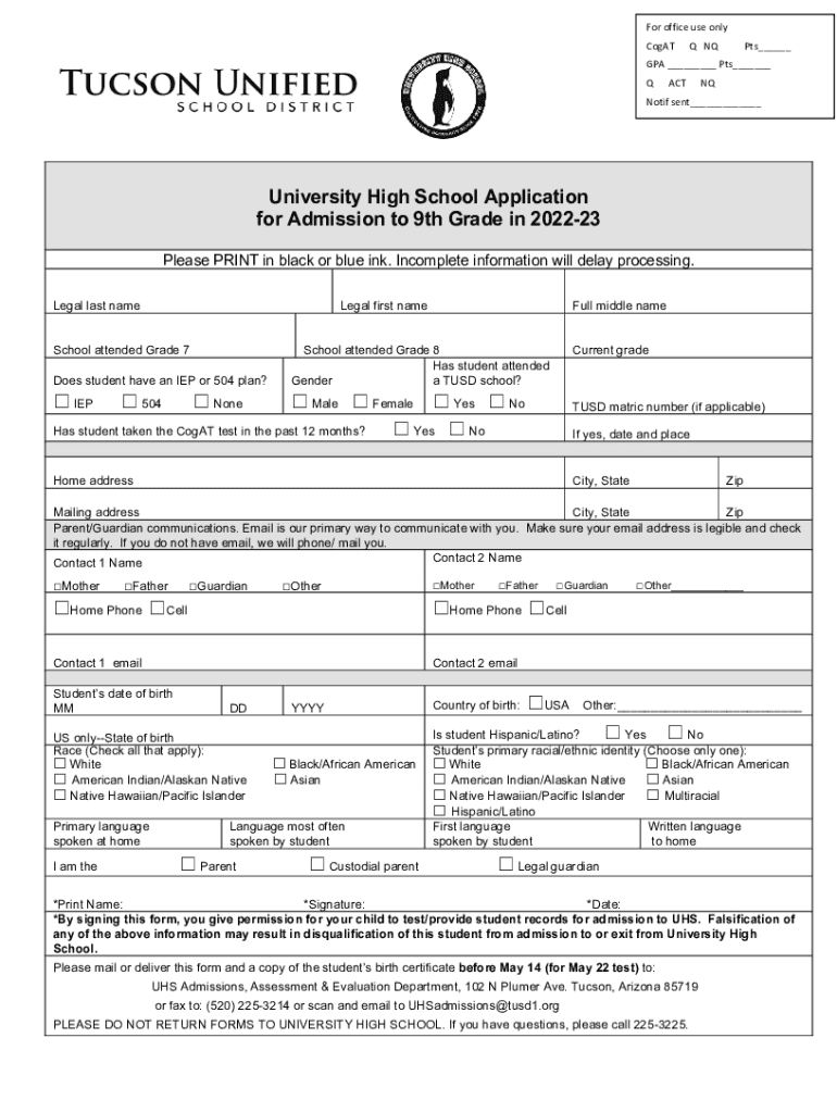 Forofficeuseonly CogATQNQPts___GPA___Pts___ACT NQNotifsent___ University High School Application for Admission to 9th Grade in 202223 Please PRINT in black or blue ink. Incomplete information will