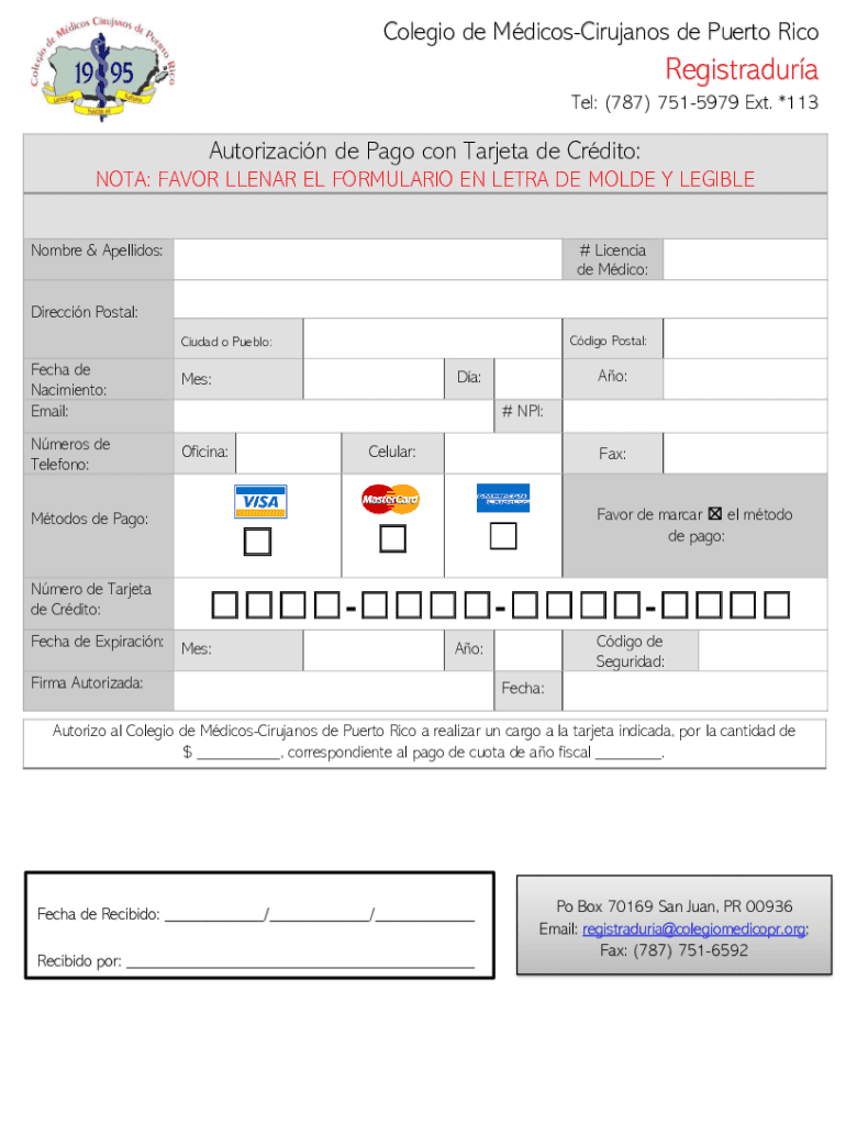 Colegio de MdicosCirujanos de Puerto RicoRegistradura Tel: (787× 7515979 Ext. *113Autorizacin de Pago con Target de Crdito: NOT: FAVOR CLEAR EL FORMULA RIO EN PETRA DE MODE Y LEGIBLE Hombre & Spellings:#