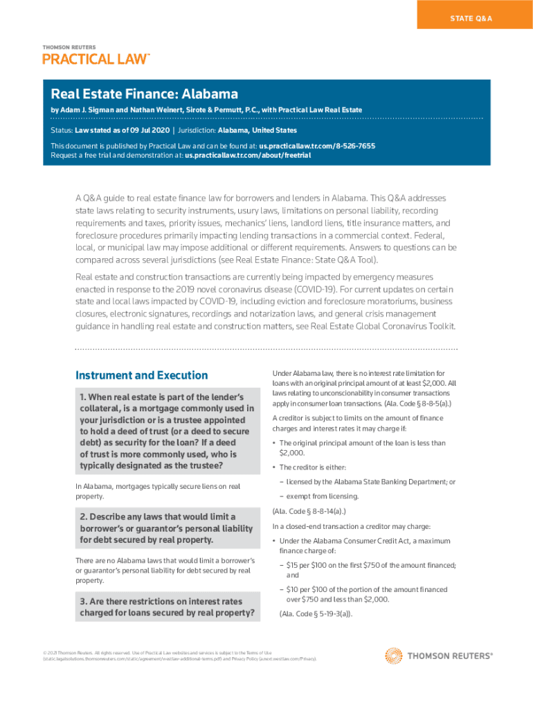STATE Areal Estate Finance: Alabama by Adam J. Sigma and Nathan We inert, Si rote & Permute, P.C., with Practical Law Real Estate Status: Law stated as of 09 Jul 2020 | Jurisdiction: Alabama, United