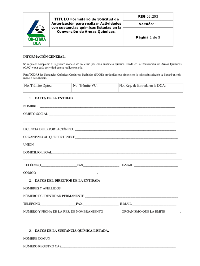 TITLE Formulation de Solicitud Derek 03.203Autorizacin para realizer Activities con substantial pumices listed en la Convention de Armas Pumices. Version: 5Pgina 1 de 5INFORMACIN GENERAL. Se require