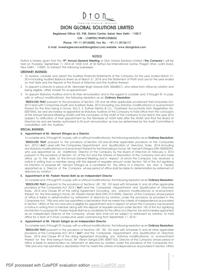 DION GLOBAL SOLUTIONS LIMITED Registered Office: D3, P3B, District Center, Sake, New Delhi 110017 IN L74899DL1994PLC058032 Phone: +911139125000, Fax No. +911139126117 Email: investor grievances dionglobal.com/website: