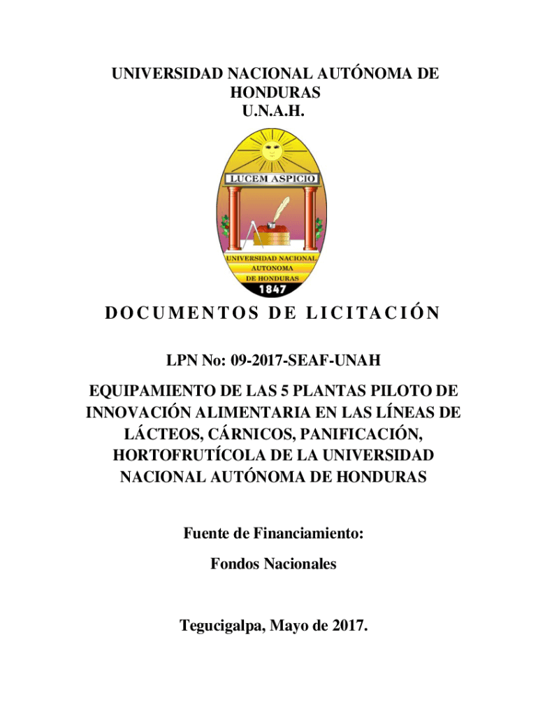 UNIVERSITY NATIONAL AUTONOMY DE HONDURAS U.N.A.H.D O C U M E N T O S D E L I C I TA C I N LPN No: 092017SEAFUNAH EQUIPMENT DE LAS 5 PLANTS PILOT ODE INNOVATION ALIMENT ARIA EN LAS LEAS DE LITERS,