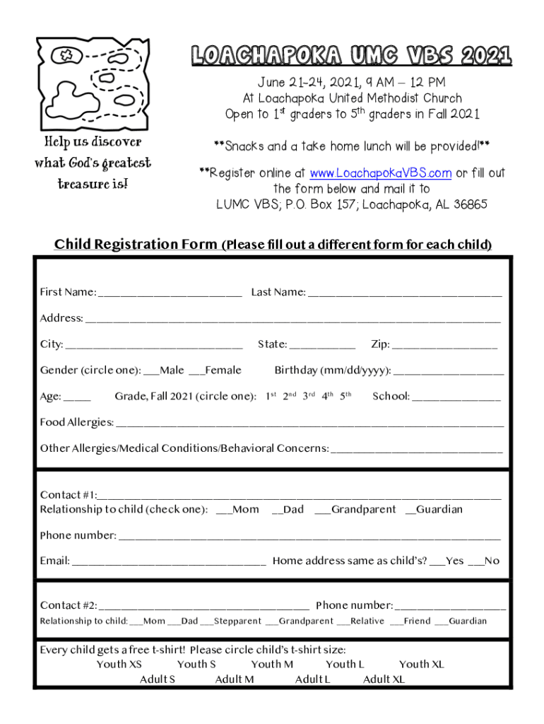 LOACHAPOKA UMC VBS 2021 June 2124, 2021, 9 AM 12 PM At Loachapoka United Methodist Church Open to 1st graders to 5th graders in Fall 2021 Help us discover what Gods greatest treasure is!**Snacks and