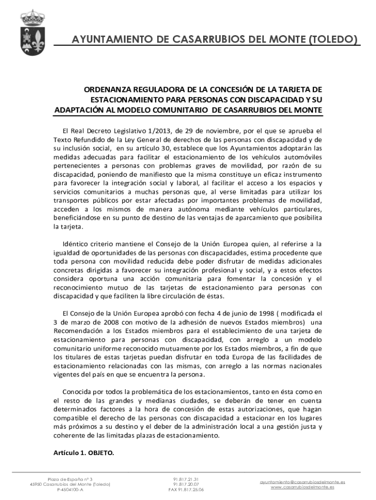 AYUNTAMIENTO DE CASARRUBIOS DEL MONTE (TOLEDO×ORDINANCE REGULATORY DE LA CONCERN DE LA TARGET DE ESTACIONAMIENTO PARA PERSONAS CON DISCAPACIDAD Y SU ADAPTATION AL MODEL COMMUNITARIAN DE CASARRUBIOS