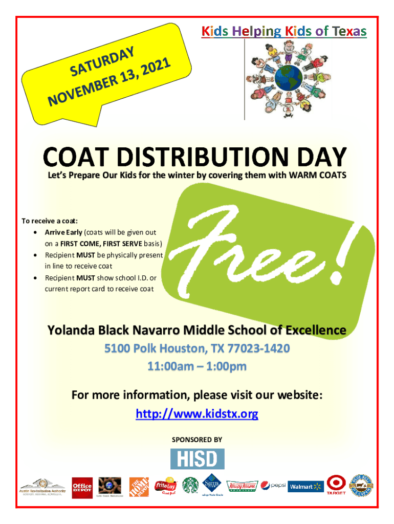Let's Prepare Our Kids for the winter by covering them with WARM Coast receive a coat: Arrive in Early (coats will be given out on a FIRST COME, FIRST Served basis) Recipient MUST be physically present