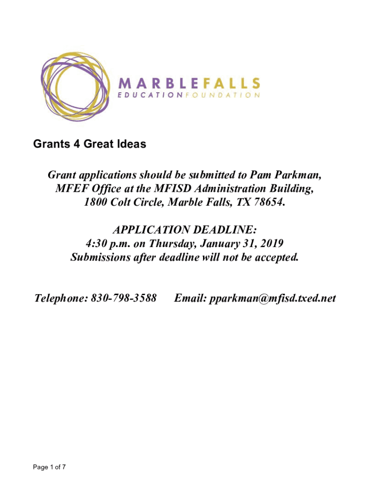Grants 4 Great Ideas Grant applications should be submitted to Pam Parkman, FEF Office at the MF ISD Administration Building, 1800 Colt Circle, Marble Falls, TX 78654. APPLICATION DEADLINE: 4:30 p.m.