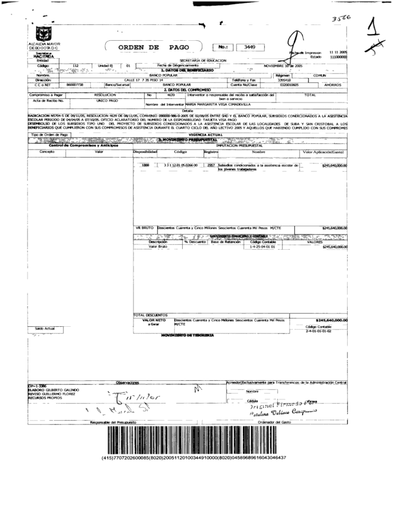 ^63×itIALCAIOA Mayor DE Bogotá D BORDEN DEPAGOEntidadSECRETARIA DE EDUCATION 2Cdgo:[Unidad ^1oTFecha de Diligenciamiento×NOVEMBER lint 2005 *Hombre.× 11 Ramen 1BANCO POPULARDireccin: 860007738CC