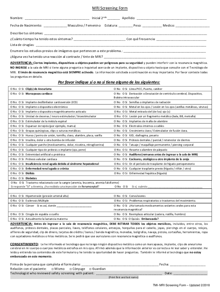 MRI Screening Form Hombre: ___ Initial 2ndo ___ Adelaide: ___ Tech de Nacimiento: ___ Masculine / FemeninoEstatura: ___ Peso: ___ Medico: ___Describe us stomas: ___ Unto tempo ha tend Estes stomas?