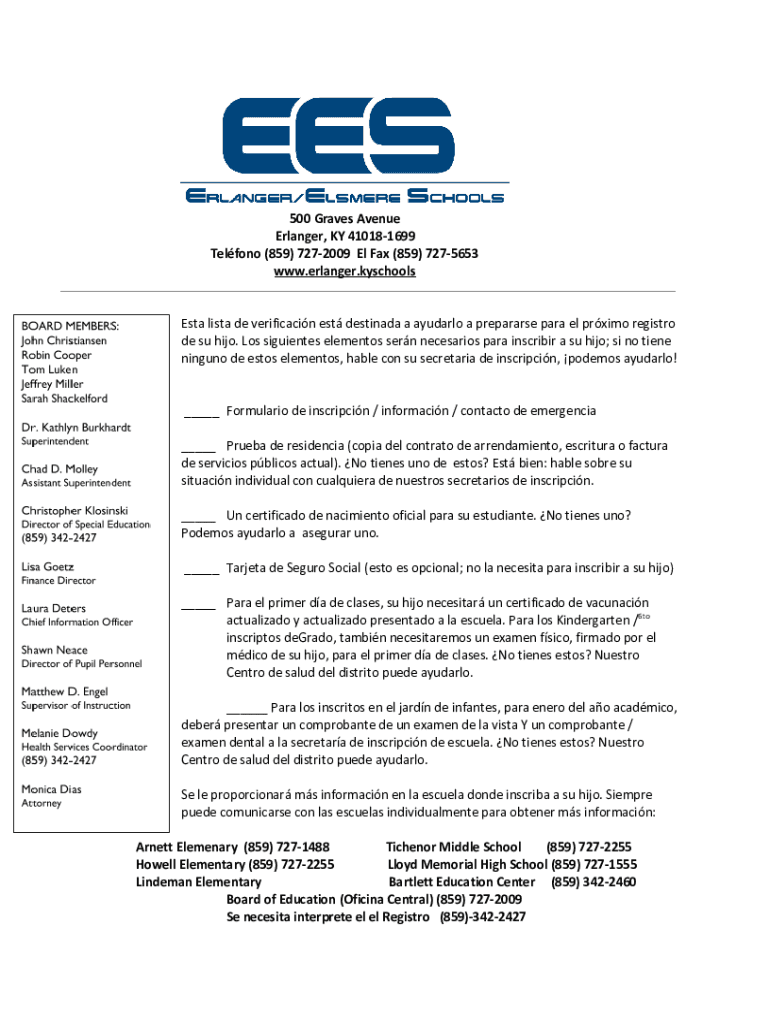 500 Graves Avenue Erlang her, KY 410181699 Teflon (859× 7272009 El Fax (859× 7275653 www.erlanger.kyschoolsEsta list DE verification est destined an ayudarlo a preparers' para El prime registry
