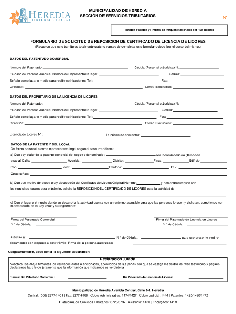 MUNICIPALIZED DE HEREDITY SECTION DE SERVICES TRIBUTARIOSNTimbres Fiscals y Timbres de Parques Nationals POR 100 colonesFORMULARIO DE SOLICITED DE REPOSITION DE CERTIFICATE DE LICENSE DE SCORES (Recede