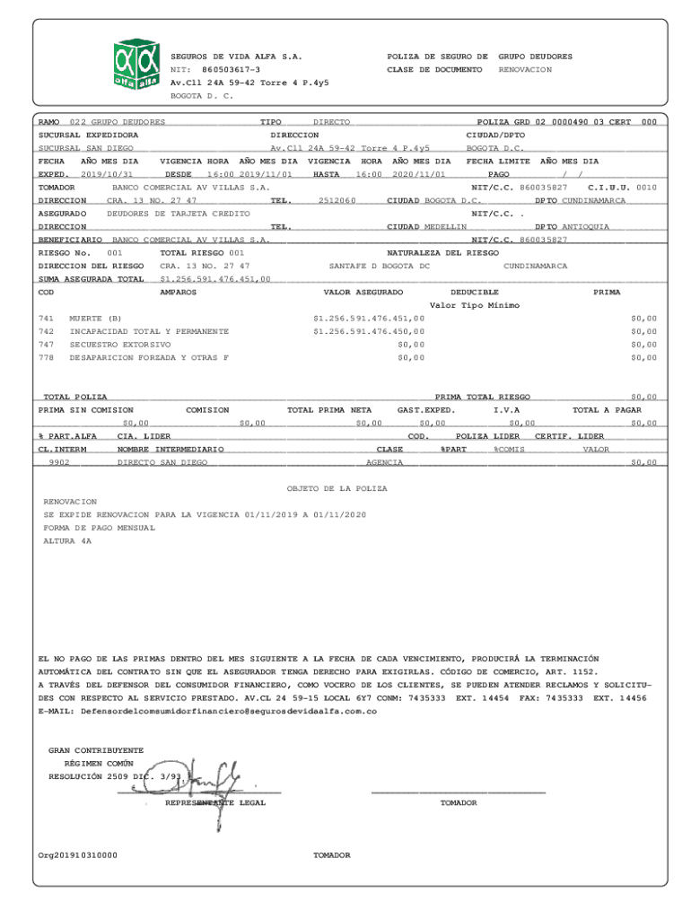 EUROS DE VIDA ALFA S.A.POLICE DE SEGURA DEGREE DEUDORESNIT:CLASS DE DOCUMENTORENOVACION8605036173Av. CLL 24A 5942 Tore 4 P.4y5 Bogotá D. C. ___ RAM 022 GRU PO DELORES TIP DIRECT POLICE GRD 02 0000490