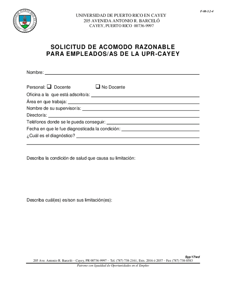 Get the free www.upr.edu cayey wp-contentSOLICITUD DE ACOMODO RAZONABLE PARA EMPLEADOS/AS DE LA U...
