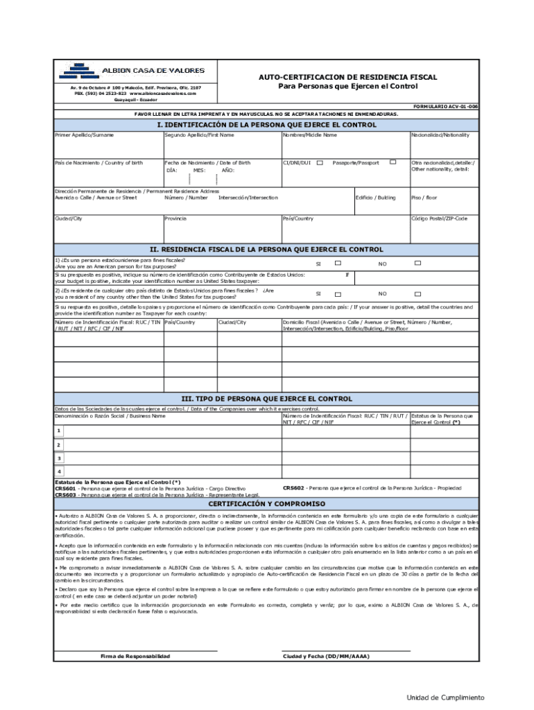 AUTOCERTIFICACION DE RESIDENCE FISCAL Para Personas Que Percent El Control Av. 9 de October # 100 y Male, Edit. Previous, FIC. 2107 PBX. (593× 04 2523823 www.albioncasadevalores.com Guayaquil EcuadorFORMULARIO
