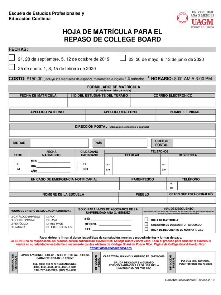Get the free HOJA DE MATRCULA PARA EL REPASO DE COLLEGE BOARD