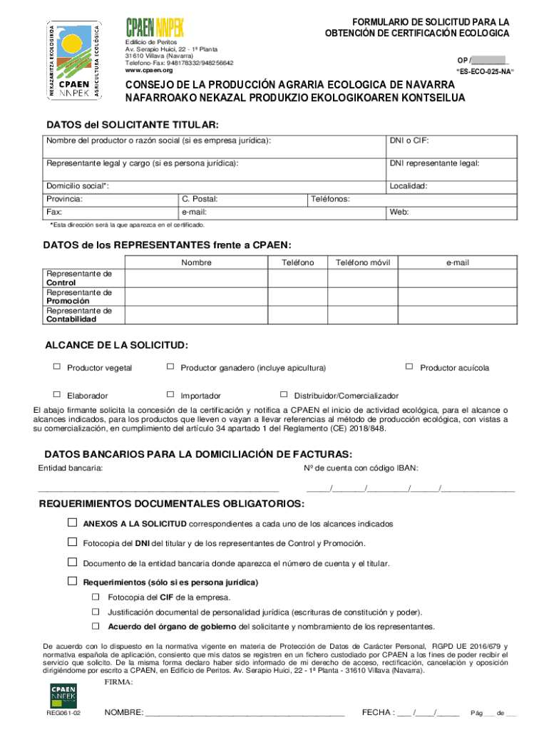 FORMULA RIO DE SOLICITED PARA LA OBTAIN DE CERTIFICATION ECOLOGICAL Edifice de Peritos Av. Sergio Hooch, 22 1 Planta 31610 Village (Navarre) Telefonica: 948178332×948256642 www.cpaen.orgOP /___ ESECO025NACONSEJO