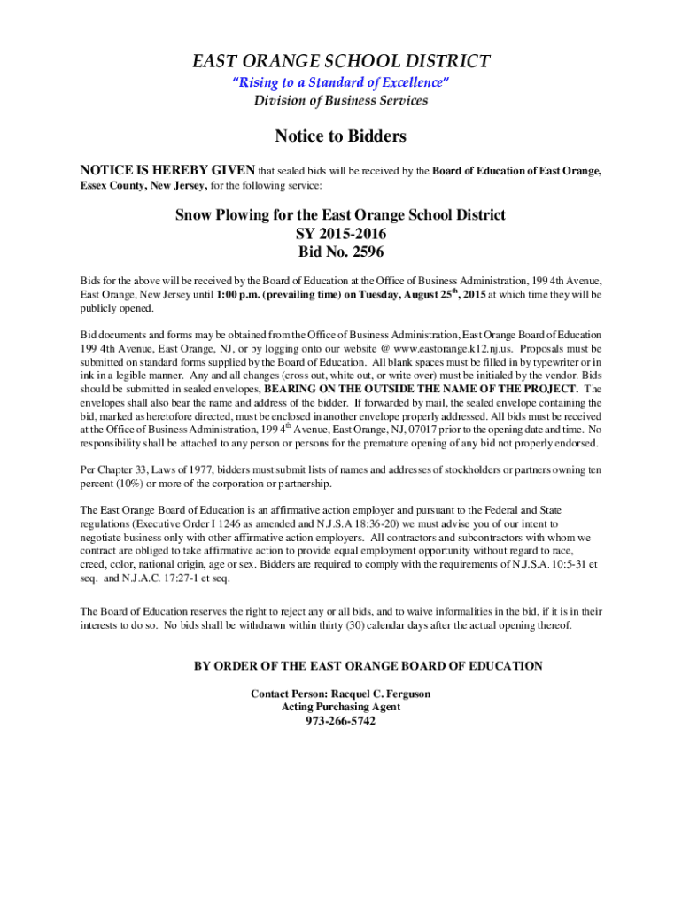 EAST ORANGE SCHOOL DISTRICT R Rising to a Standard of Excellence Division of Business ServicesNotice to Bidders NOTICE IS HEREBY GIVEN that sealed bids will be received by the Board of Education of
