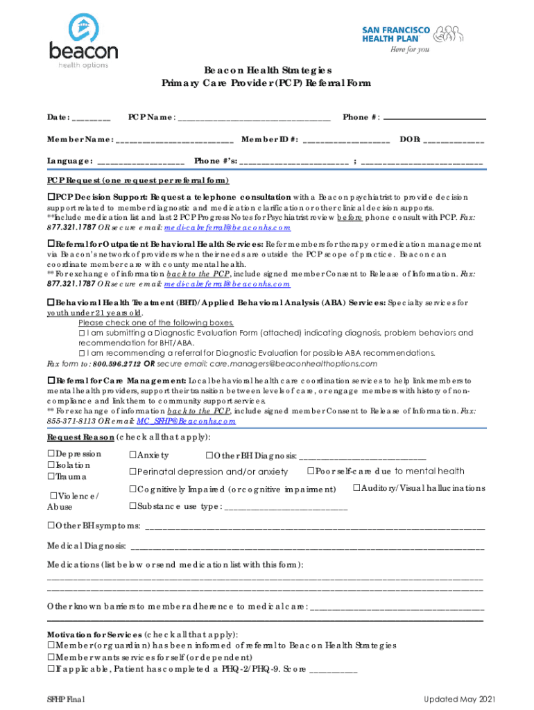 Beacon Health Strategies Primary Care Provider (PCP) Referral Form Date: ___PCP Name: ___Phone #:Member Name: ___ Member ID #: ___ Language: ___DOB: ___Phone #s: ___ ; ___PCP Request (one request