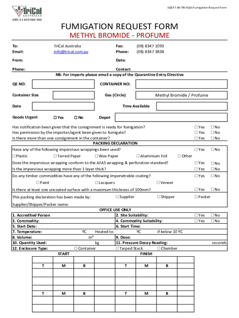 SQEF780TRI AXIS Fumigation Request Form ABN 31 600 066 966FUMIGATION REQUEST FORM METHYL BROMIDE Profusely: Email:Fax: Phone:Trial Australia info×trical.com.AU×08× 8347 1093 ×08× 8347 3838From:Date:Phone:Contact: