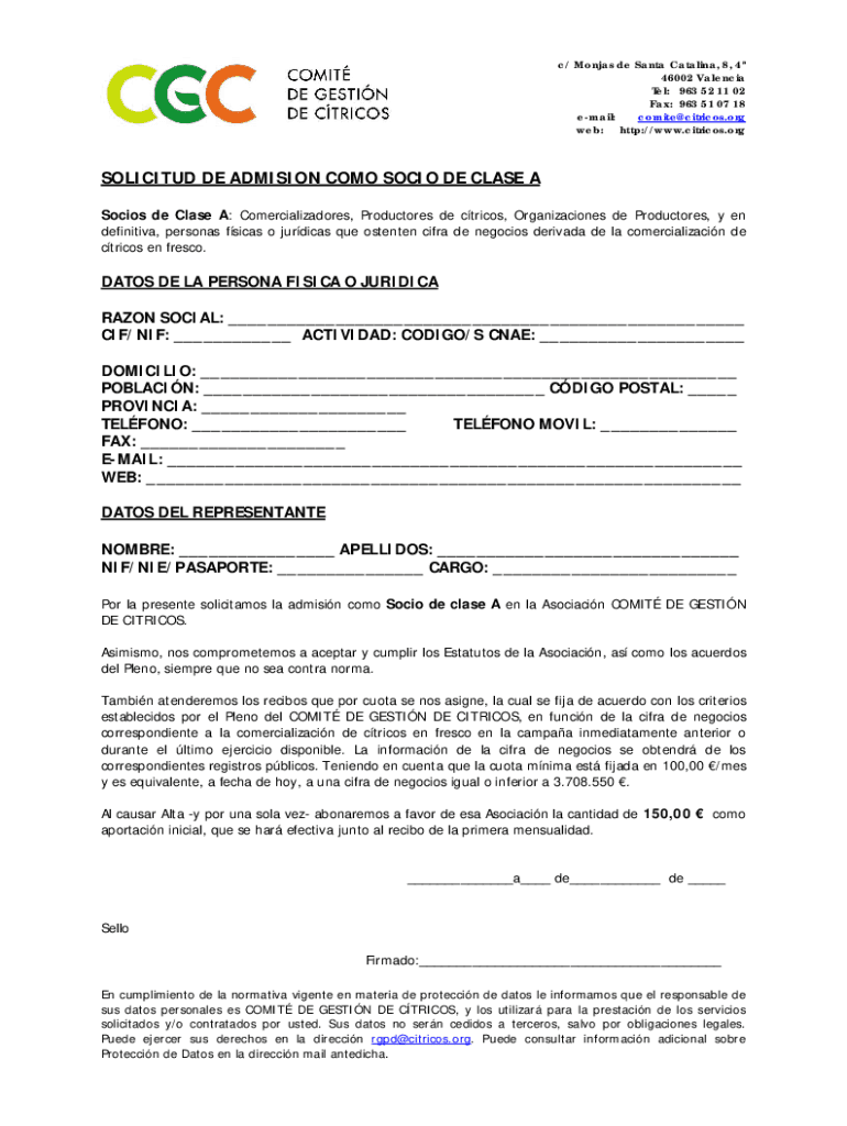 C/ Monkeys de Santa Catalina, 8, 4 46002 Valencia Tel: 963 52 11 02 Fax: 963 51 07 18 Comte×citric.org email: web: HTTP://www.citricos.orgSOLICITUD DE ADMISSION COMO SO CIO DEC LASE A Social de Clase