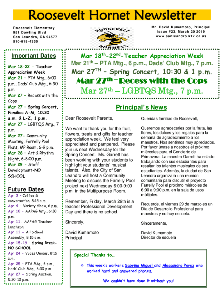 Roosevelt Hornet Newsletter M r. D a vi d K u m an m o t o, P r i n c i p an l Issue #23, March 20, 2019 www.sanleandro.k12.ca.usR o s e ve l t E l e m e n t an r y 9 5 1 D ow l i n g B l VD San Leandro,